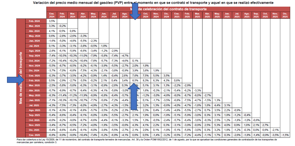 El Ministerio de Transportes pública una tabla en el siguiente enlace: https://www.transportes.gob.es/transporte-terrestre/servicios-al-transportista/indice-de-variacionmensual-de-los-precios-medios-del-gasoleo-en-espana